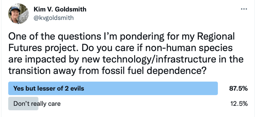 Part of my Regional Futures work has been looking at the impact of renewables on the more-than-human world. My time reading books, poring over research papers, editorials, social media threads, and talking to knowledge specialists and interested community members has raised a number of issues about our push to renewables impacting on more-than-human species—things like wind turbine placements impacting the flight paths of bats and birds; earthworms and other macrofauna being impacted by their sensitivity to low-frequency vibrations from wind turbines; and large scale solar farms changing the movement of water through the landscape. Even small coastal off-grid, co-operative lifestyle set-ups require land to be cleared to be productive or to provide enough light for solar energy production, in turn creating imbalances in the environment. Humans dominate the narrative at every turn.