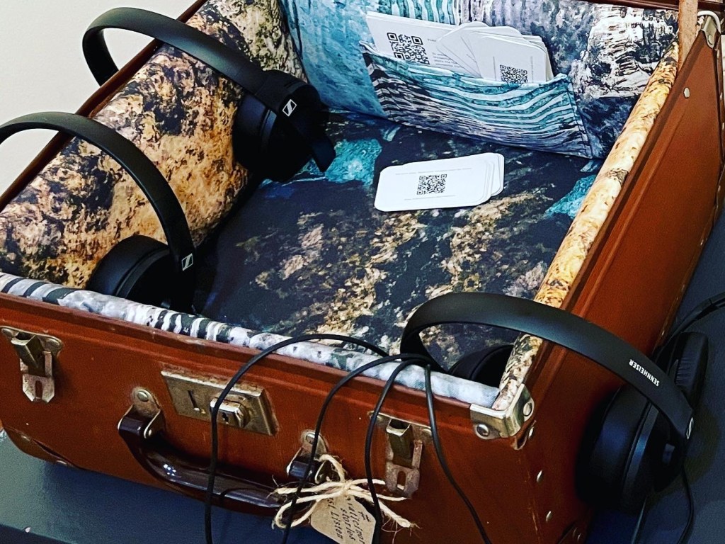Eighteen Vaticinor Stories are housed in a vintage suitcase I sourced in Wingham while doing a residency there in October 2022, upholstered with custom-printed organic cotton fabric as a way of presenting audio stories from individuals across our inland and coastal communities, who generously share their hopes and fears for the future and the actions theyโre taking to feel more empowered about it. The audio montage in the suitcase is supported by a hard copy transcript and webpage housing the full-length versions of each story and transcripts, accessible via QR codes on postcards in the suitcase. Itโs here the public are invited to share their thoughts about the future through an online form or in a notebook in the space.