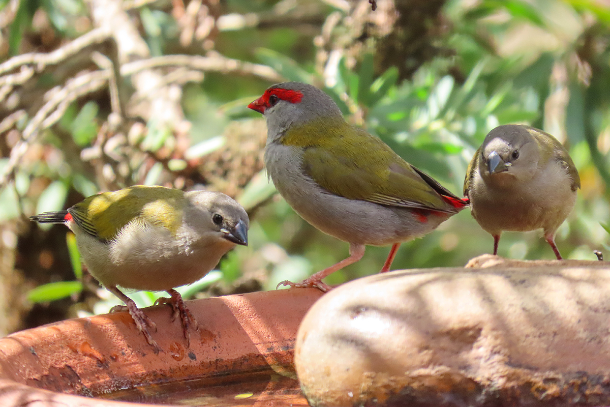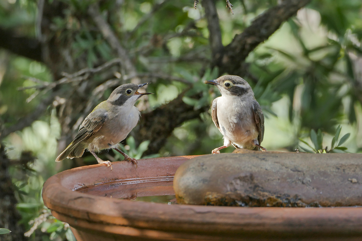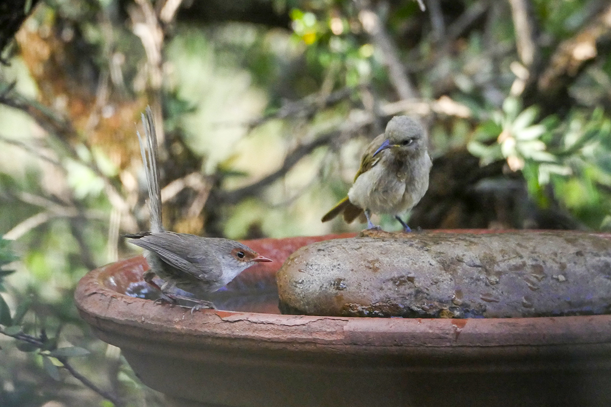 Along with listening, I observe. This summer, I’ve spent hours watching and photographing the birds in my garden—mostly from my kitchen window (fly screen removed for better viewing). I have a birdbath set up about five metres from the window, nestled beneath a shrubby Callistemon and a collection of drums, bathtubs, and sinks that grow my seasonal greens and herbs.