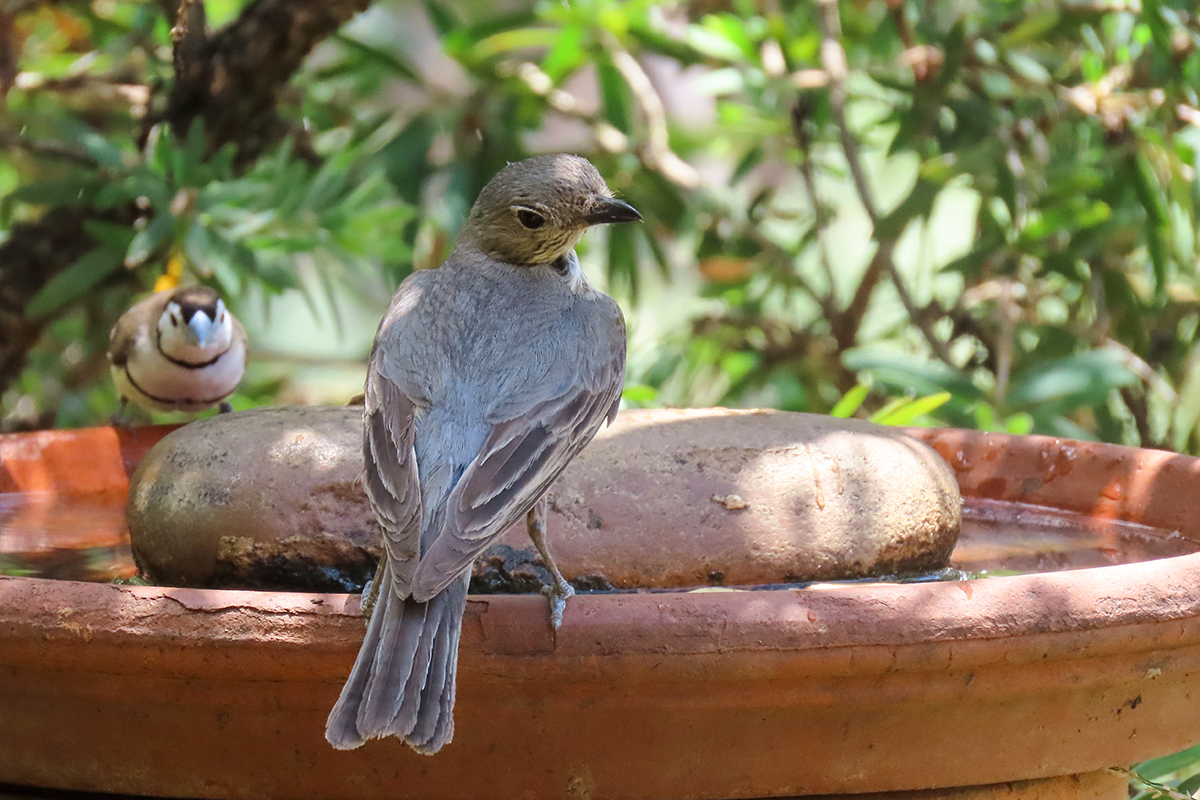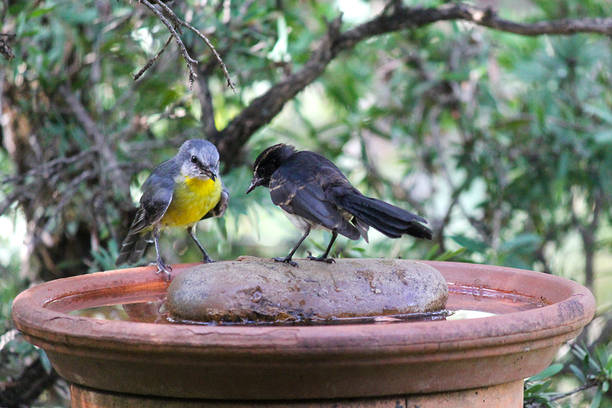 It’s then a matter of providing watering points for different species of birds. I have the veggie patch birdbath for the little birds who want the cover of a shrub, a more open, lower but raised birdbath for the slightly bigger birds and those who can’t wait to take their turn in the veggie garden. Then, there’s ground level baths in wilder parts of the garden for the bigger woodland birds who don’t come close to the house, as well as the lizards and echidnas. The bees and wasps take their pick depending on what suits.