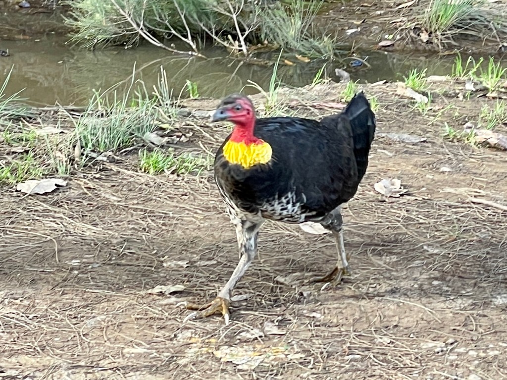 Above (left to right/ top to bottom): The base of massive figs, signage at one of the entrances to the reserve, the boardwalk in the early morning, canopy, the Manning River from the edge of the boardwalk, and a brush turkey. (October 2022, Kim V. Goldsmith)