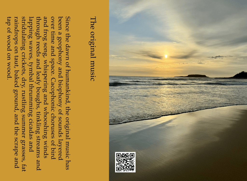 Kim V. Goldsmith, Mixed Tape Summer soundtrack, 2025, field recordings from the Eurobodalla coast and hinterland recorded over several years, duration: 14 minutes. Designed to be listened to with headphones.
