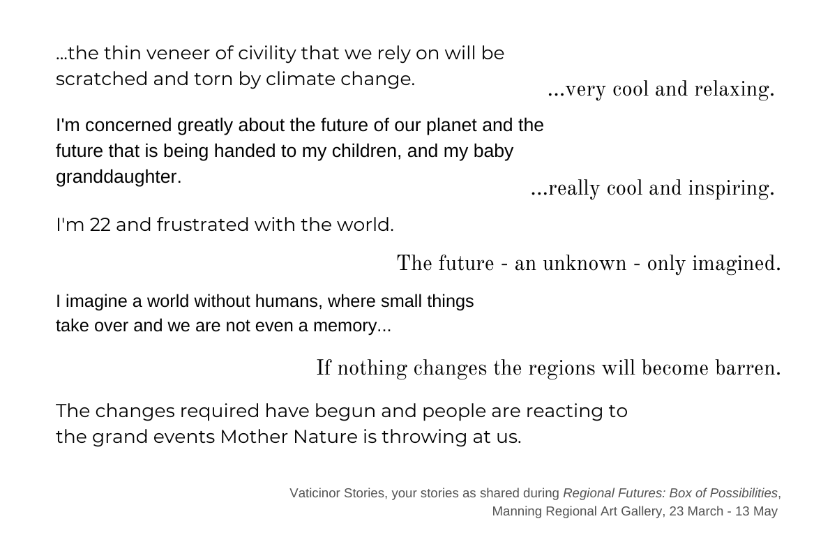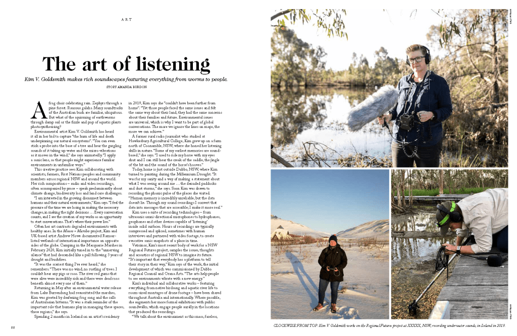 Vaticinor is a body of work created by Kim V. Goldsmith for the Regional Futures project in 2022-23, that have since been presented in various formats including an exhibition, a soundwalk, on radio, in a music festival performance, online talks and editorials. This page documents some of the feedback and responses to the work. The concepts developed for the Vaticinor were commissioned by Dubbo Regional Council’s Cultural Development team and Orana Arts for Regional Futures and included four residency sites across NSW over six months. The Manning Regional Art Gallery exhibition was negotiated for the artists in a cross-region conversation between Orana Arts and Mid North Coast arts. The Vaticinor works have now been selected to be presented with those of other Regional Futures artists at Casula Powerhouse Arts Centre from mid-June 2023. As the lead artist, Kim has now secured an exhibition for seven Regional Futures artists at The Basil Sellers Exhibition Centre in late 2024.
